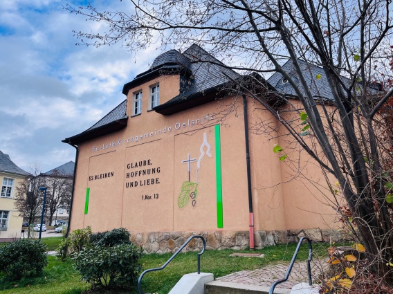 In Kooperation mit team2e aus Lugau gestalteten wir die Fasse des Pfarramtes in Oelsnitz/Erzgeb. Glaube, Hoffnung und Liebe bleiben feste Säulen im Leben. Repräsentativ und einladend verschönern sie nun die Giebelseite des Pfarramtes.
